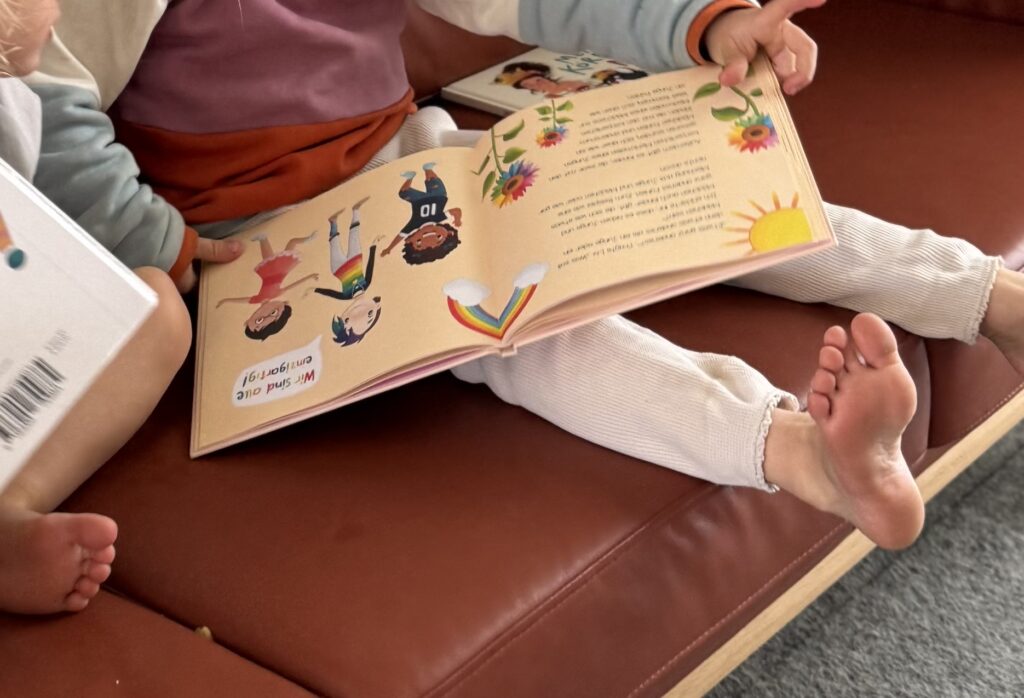 Leseförderung: Zur sprachlichen Förderung gehört neben dem Sprechen auch das Zuhören. Selbstverständlich können sich die Kinder jederzeit an unserer „Bibliothek“ bedienen. Aber einmal in der Woche besucht uns auch unsere ehrenamtliche „Leseoma“, die ein abwechslungsreiches Repertoire an Büchern mitbringt, ihnen vorliest und sich auch weitere schöne Dinge für die Kinder überlegt.
